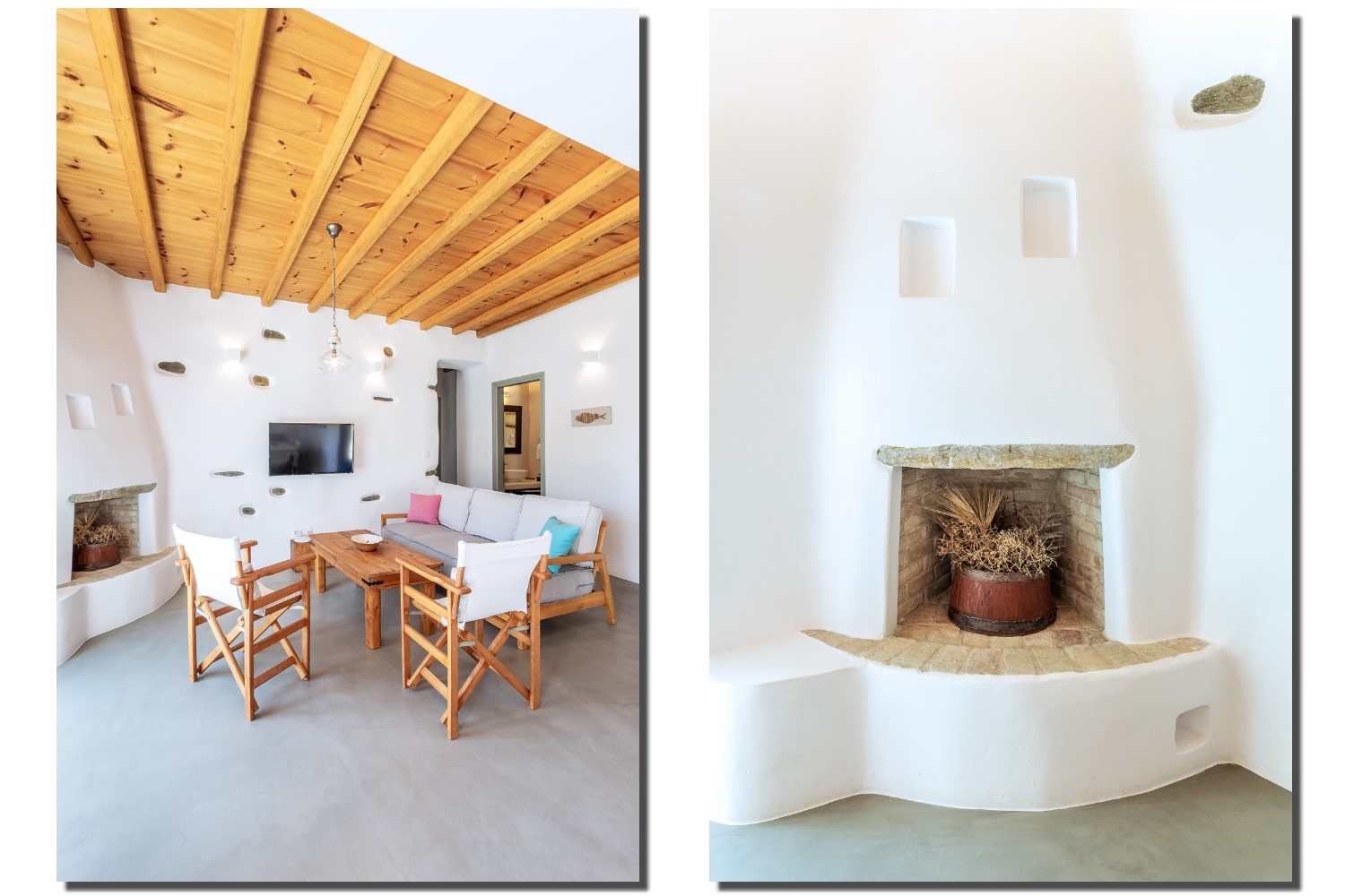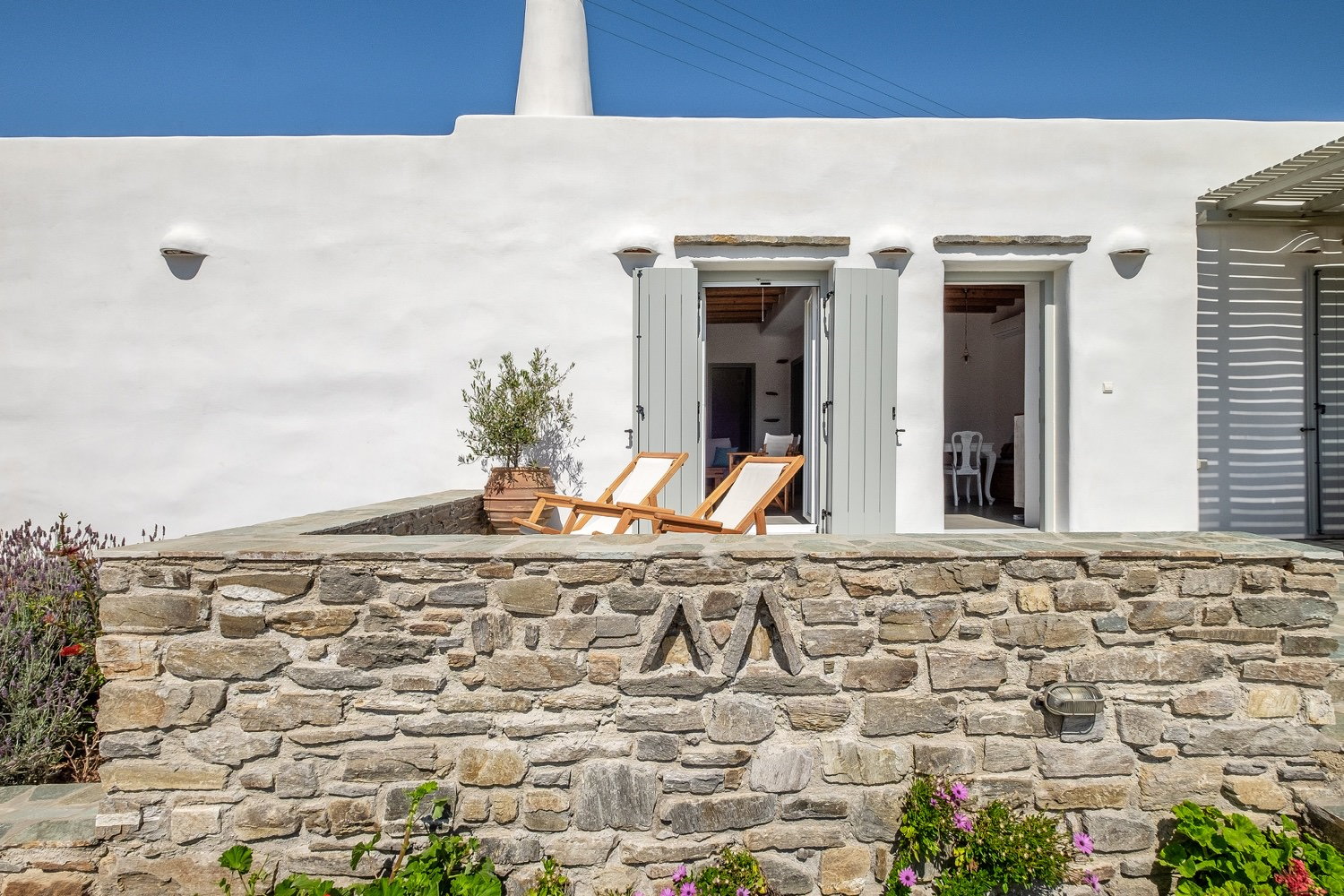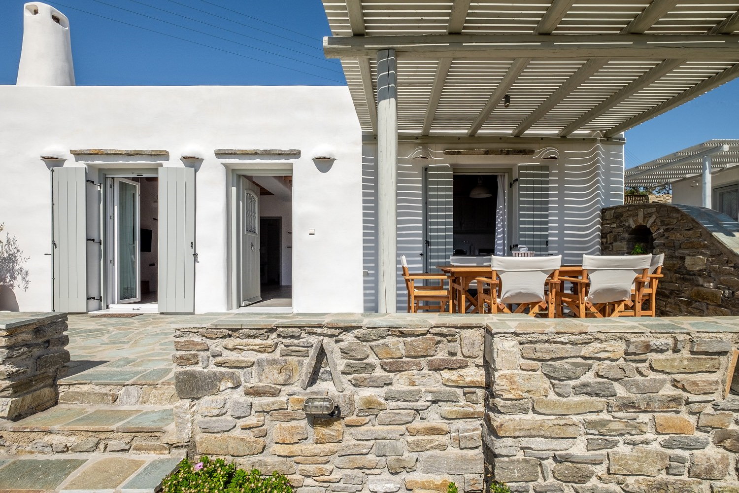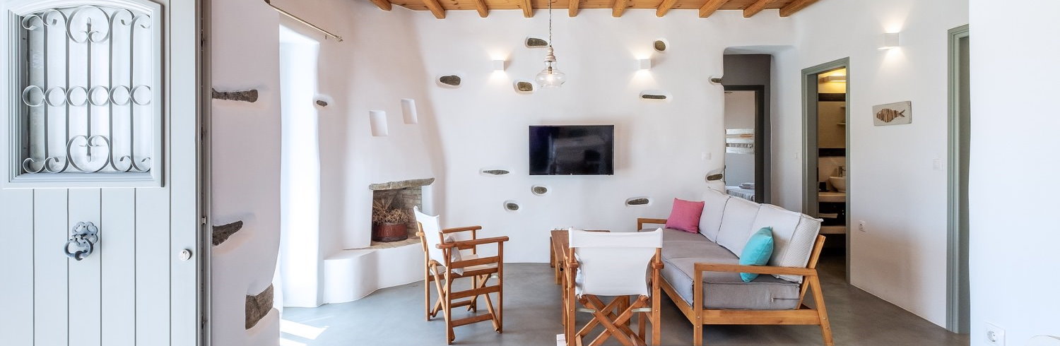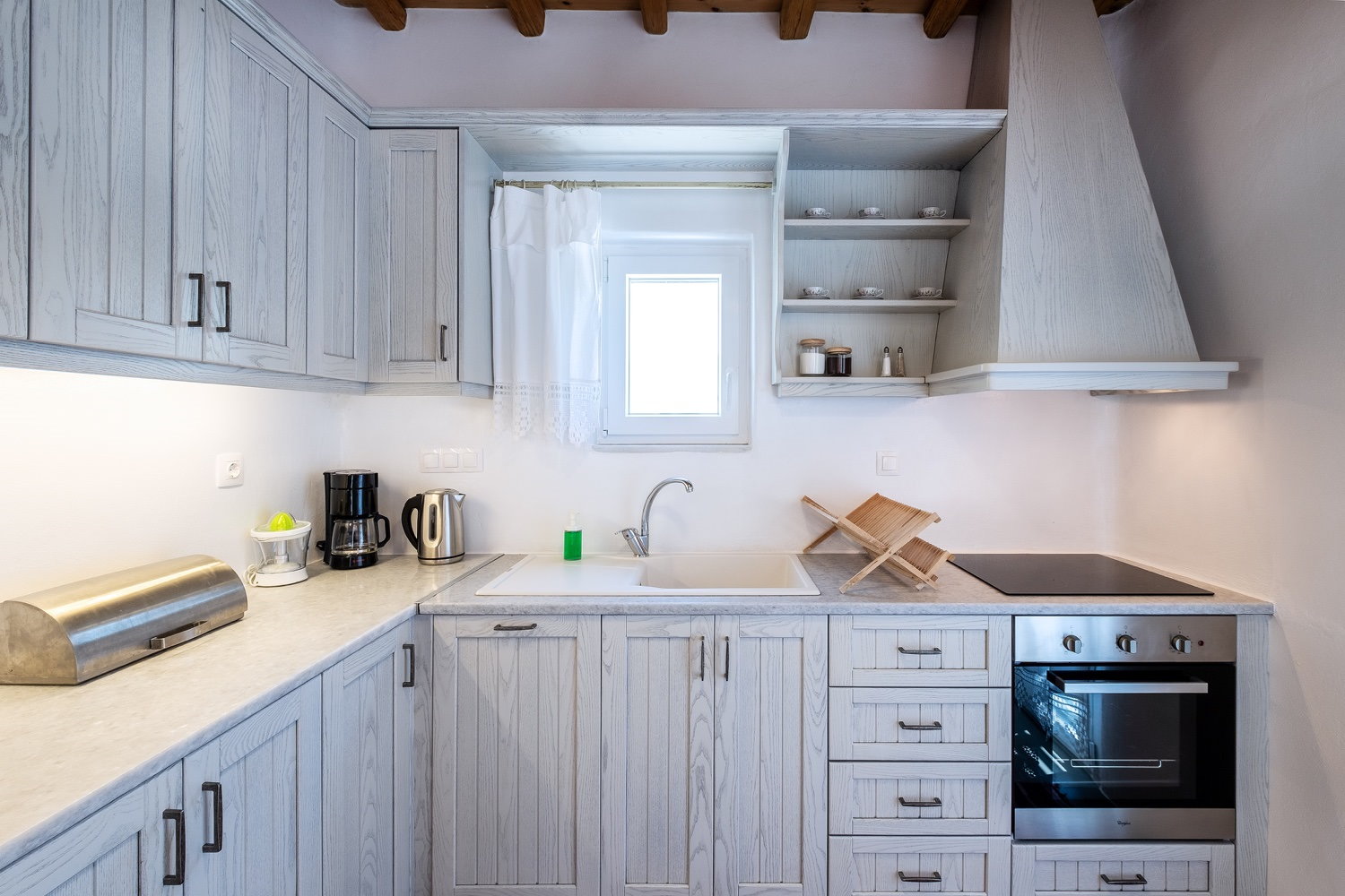It is a 105m2 three-bedroom house, ideal for large groups or families. Two bedrooms (one double queen bed and one bunk bed) face south and share a covered terrace with sea views next to the barbecue area. The third bedroom (double queen bed) faces north and has access to its own terrace. Two full bathrooms can meet your personal needs. The central room consists of a combination of living room and dining room. The living room, with a decorative traditional fireplace in the corner, is a very spacious area, while the dining area has a 6-seater table. A stone archway leads to the kitchen, which is fully equipped and opens onto the front terrace with sea views. You can use the dining area on the covered part of the terrace or relax and admire the scenery on the sun loungers on the rest part of the uncovered terrace.