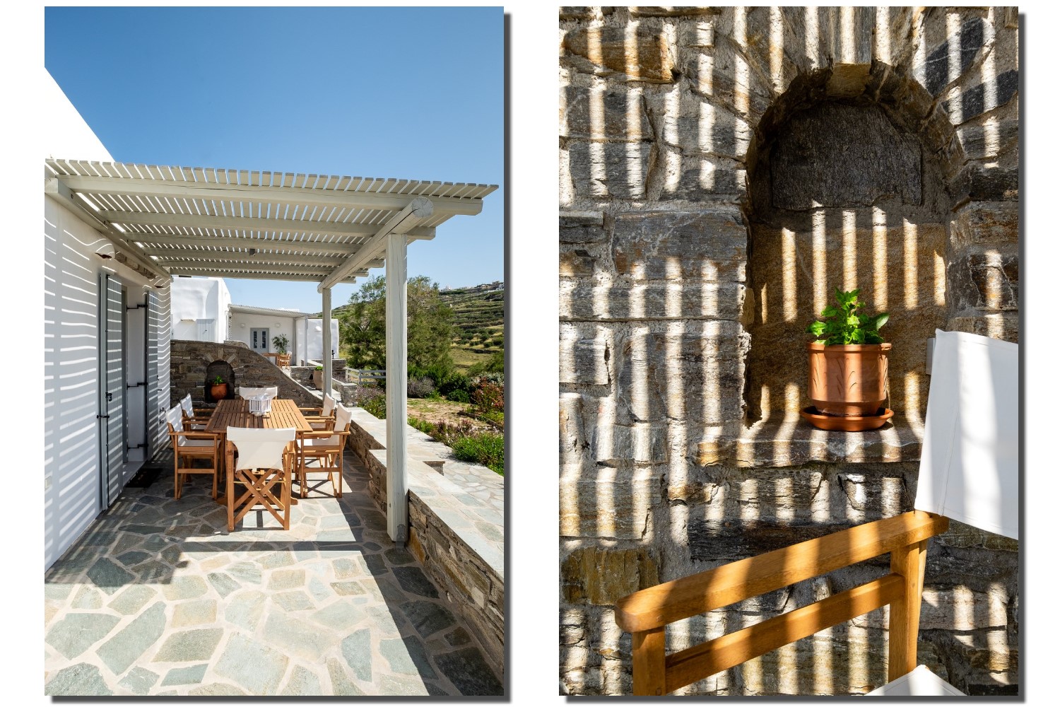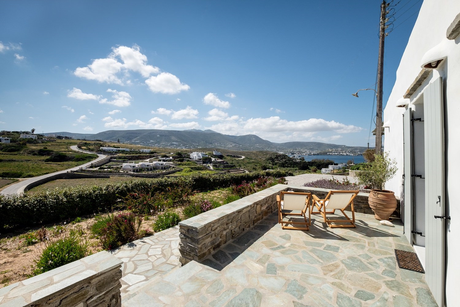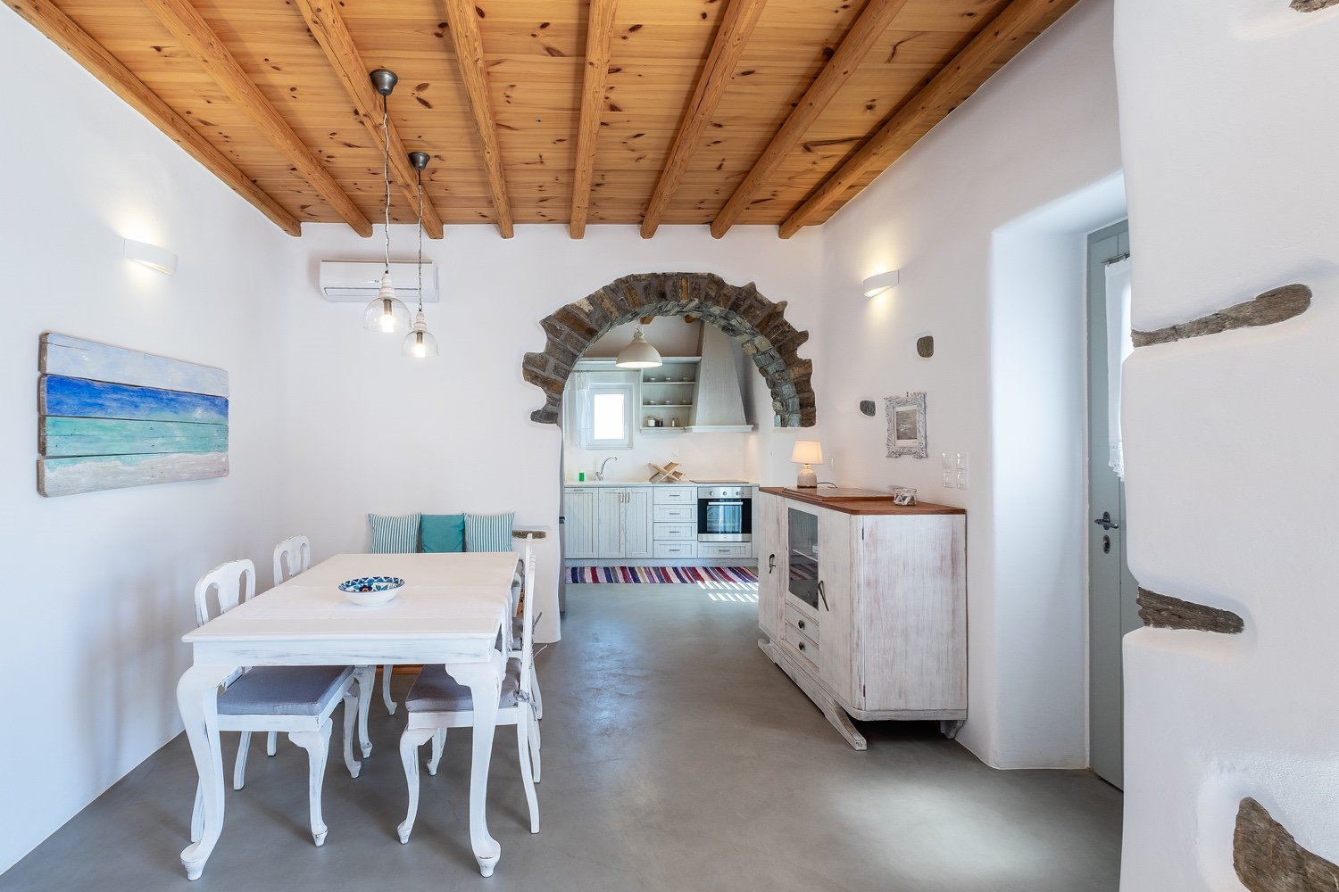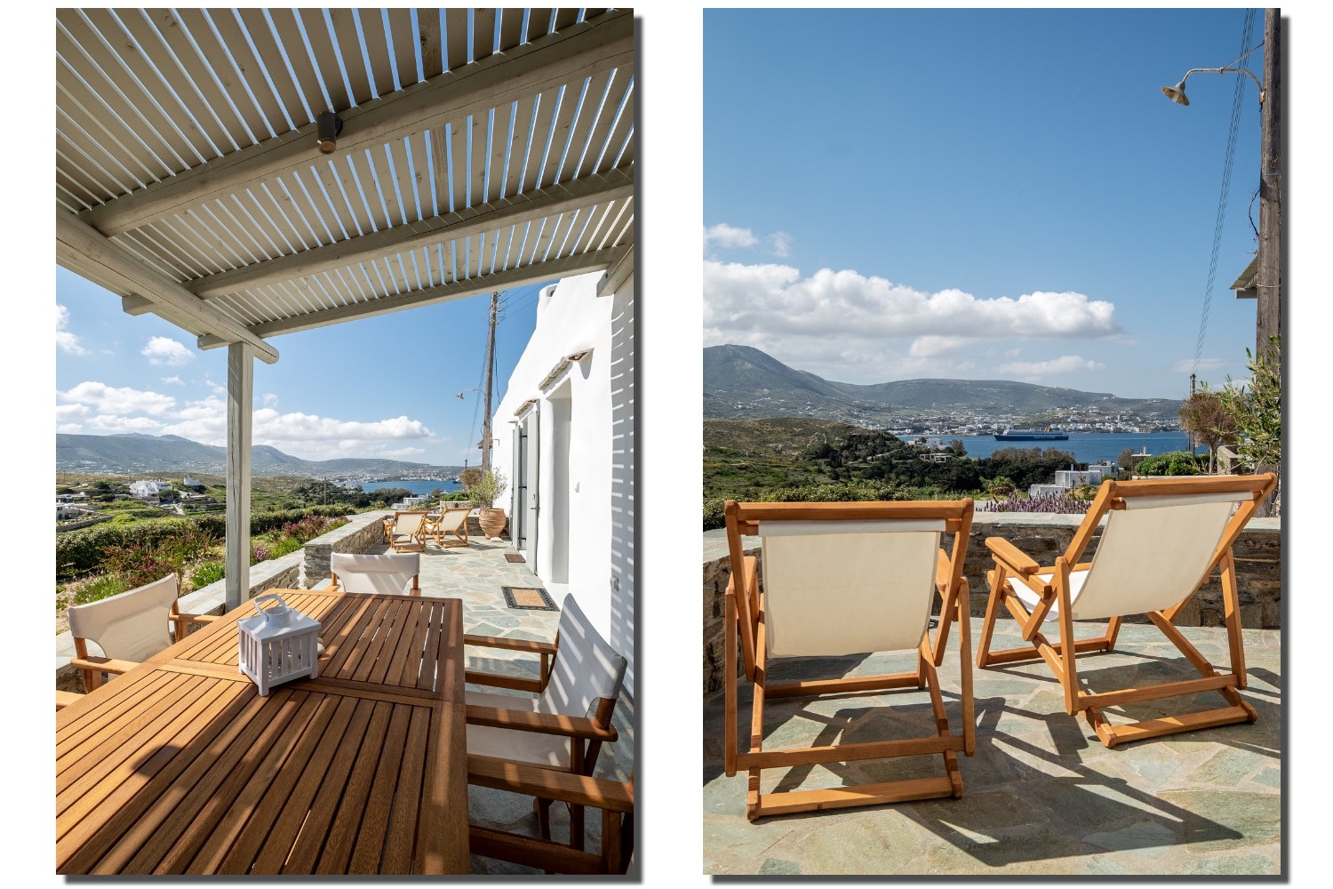 It is a 105m2 three-bedroom house, ideal for large groups or families. Two bedrooms (one double queen bed and one bunk bed) face south and share a covered terrace with sea views next to the barbecue area. The third bedroom (double queen bed) faces north and has access to its own terrace. Two full bathrooms can meet your personal needs. The central room consists of a combination of living room and dining room. The living room, with a decorative traditional fireplace in the corner, is a very spacious area, while the dining area has a 6-seater table. A stone archway leads to the kitchen, which is fully equipped and opens onto the front terrace with sea views. You can use the dining area on the covered part of the terrace or relax and admire the scenery on the sun loungers on the rest part of the uncovered terrace.
