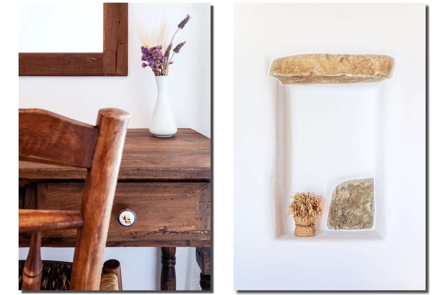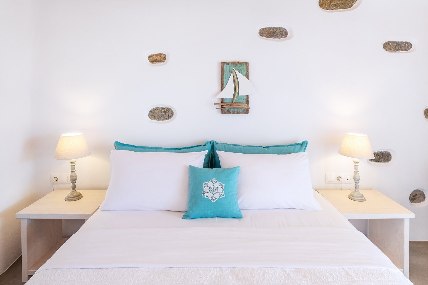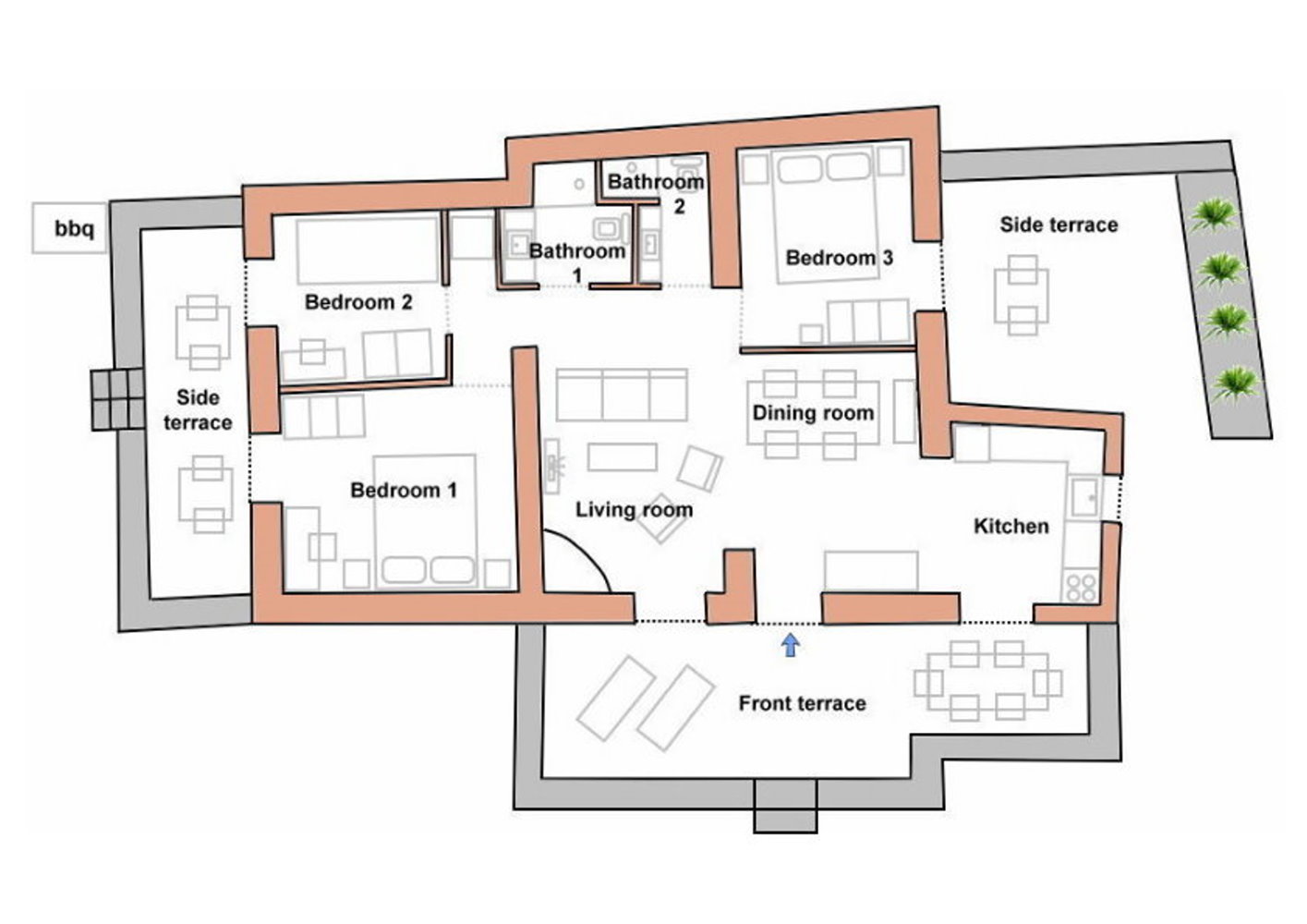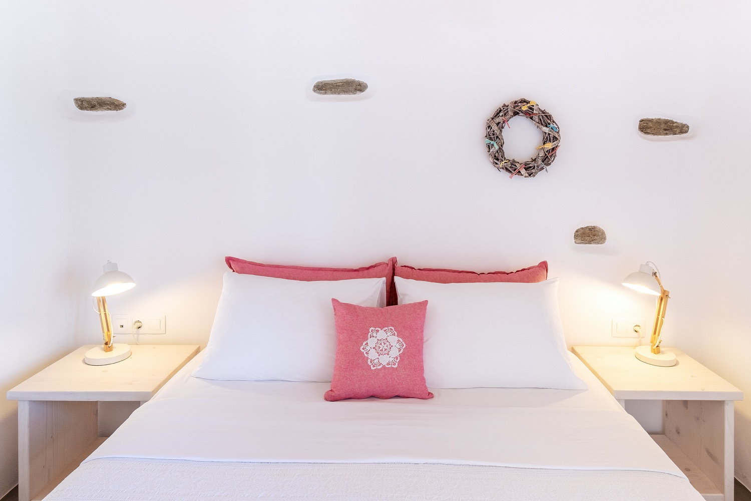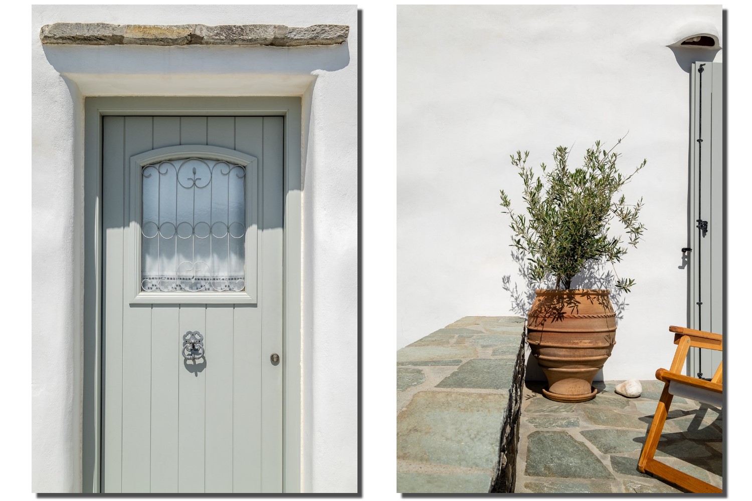 It is a 105m2 three-bedroom house, ideal for large groups or families. Two bedrooms (one double queen bed and one bunk bed) face south and share a covered terrace with sea views next to the barbecue area. The third bedroom (double queen bed) faces north and has access to its own terrace. Two full bathrooms can meet your personal needs. The central room consists of a combination of living room and dining room. The living room, with a decorative traditional fireplace in the corner, is a very spacious area, while the dining area has a 6-seater table. A stone archway leads to the kitchen, which is fully equipped and opens onto the front terrace with sea views. You can use the dining area on the covered part of the terrace or relax and admire the scenery on the sun loungers on the rest part of the uncovered terrace.