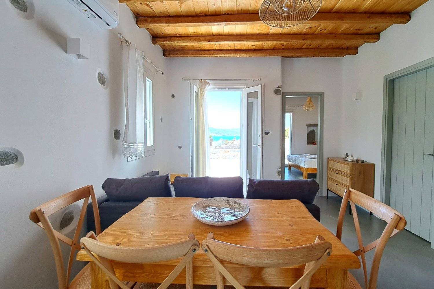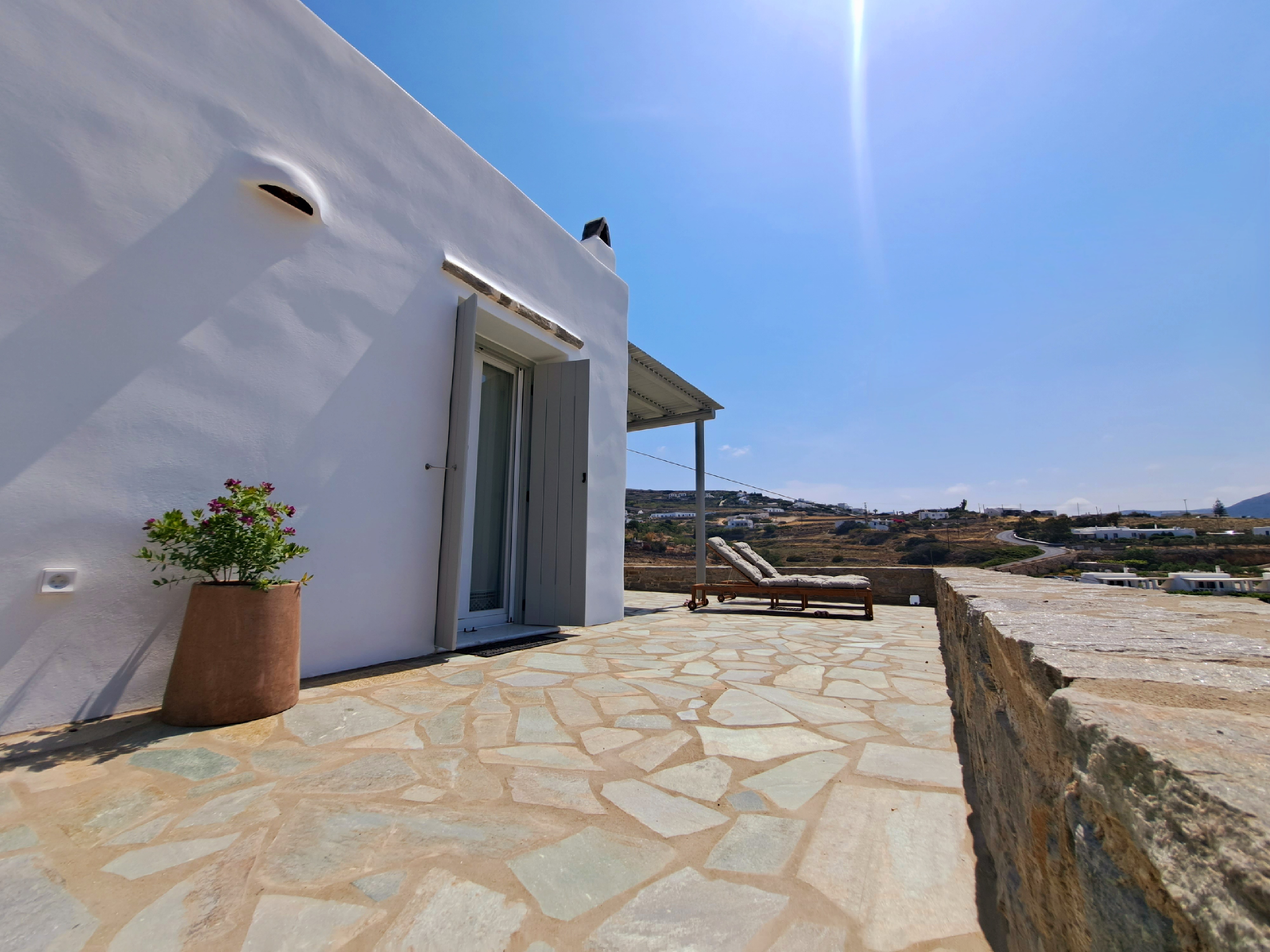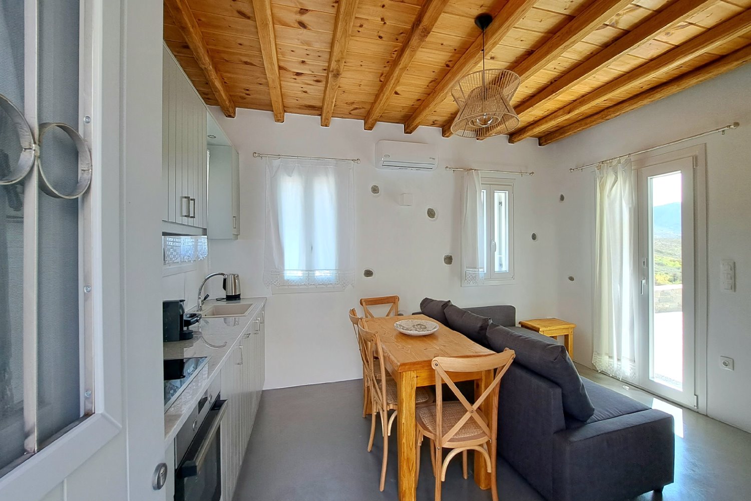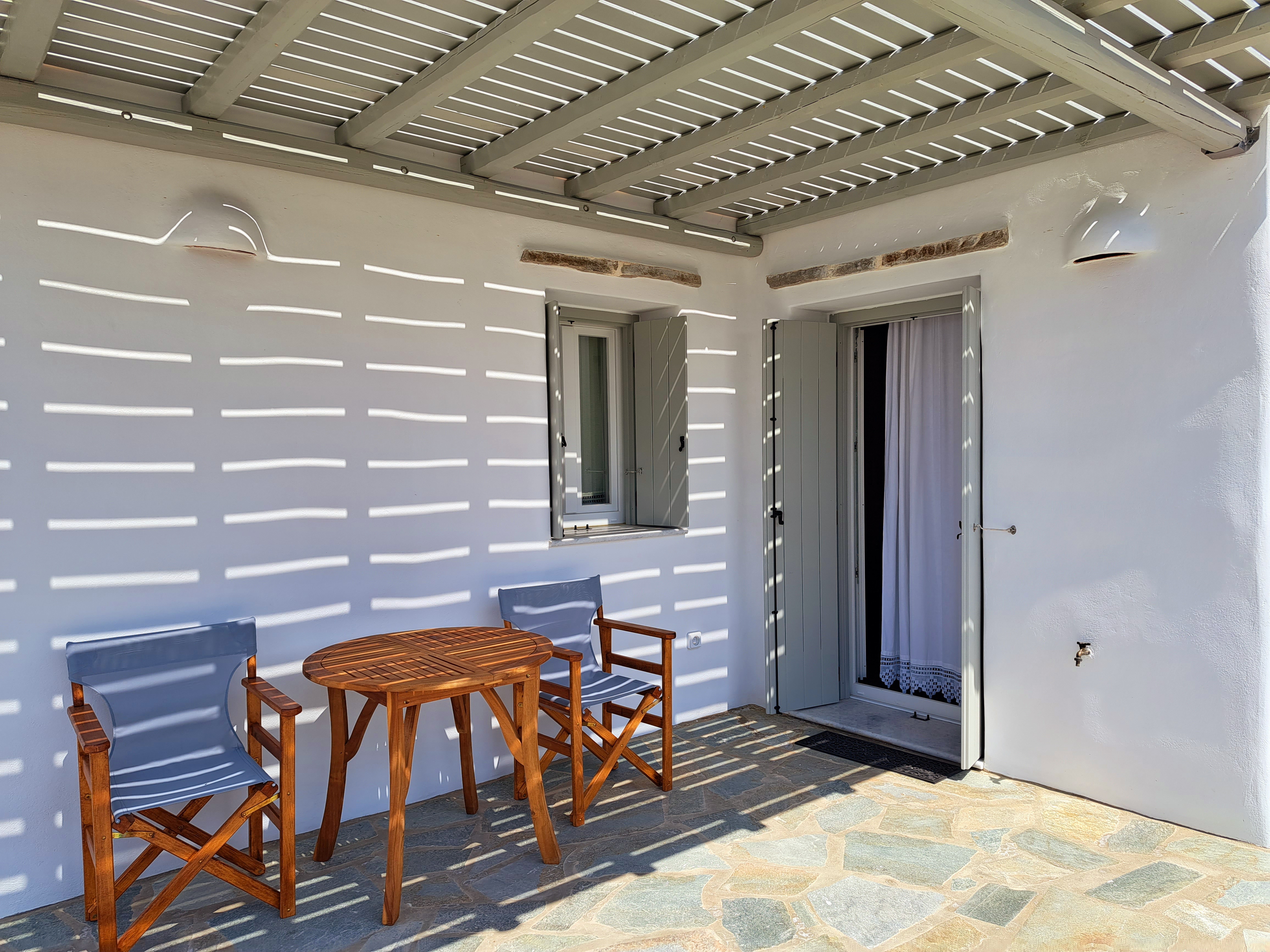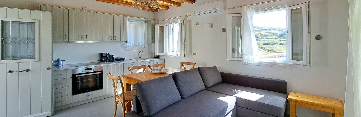 It is a 50m2 one-bedroom house, ideal for couples and families with 1-2 children. The bedroom faces southeast, has a double queen bed and direct access to the main terrace with sea views. A full bathroom can meet your personal needs. Living room, dining room and kitchen are concentrated in the central room. The corner sofa can easily be converted into a double bed and there is space for 4 people at the dining table. The kitchen is fully equipped and offers direct access to the barbecue in the backyard. On the front terrace you can enjoy your breakfast, lunch or dinner or relax on the sun loungers and enjoy the sea views.