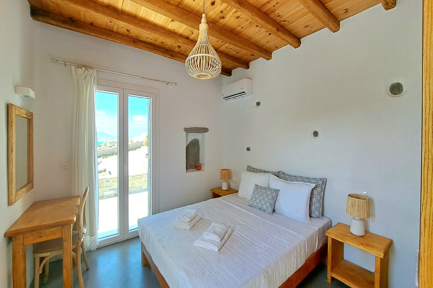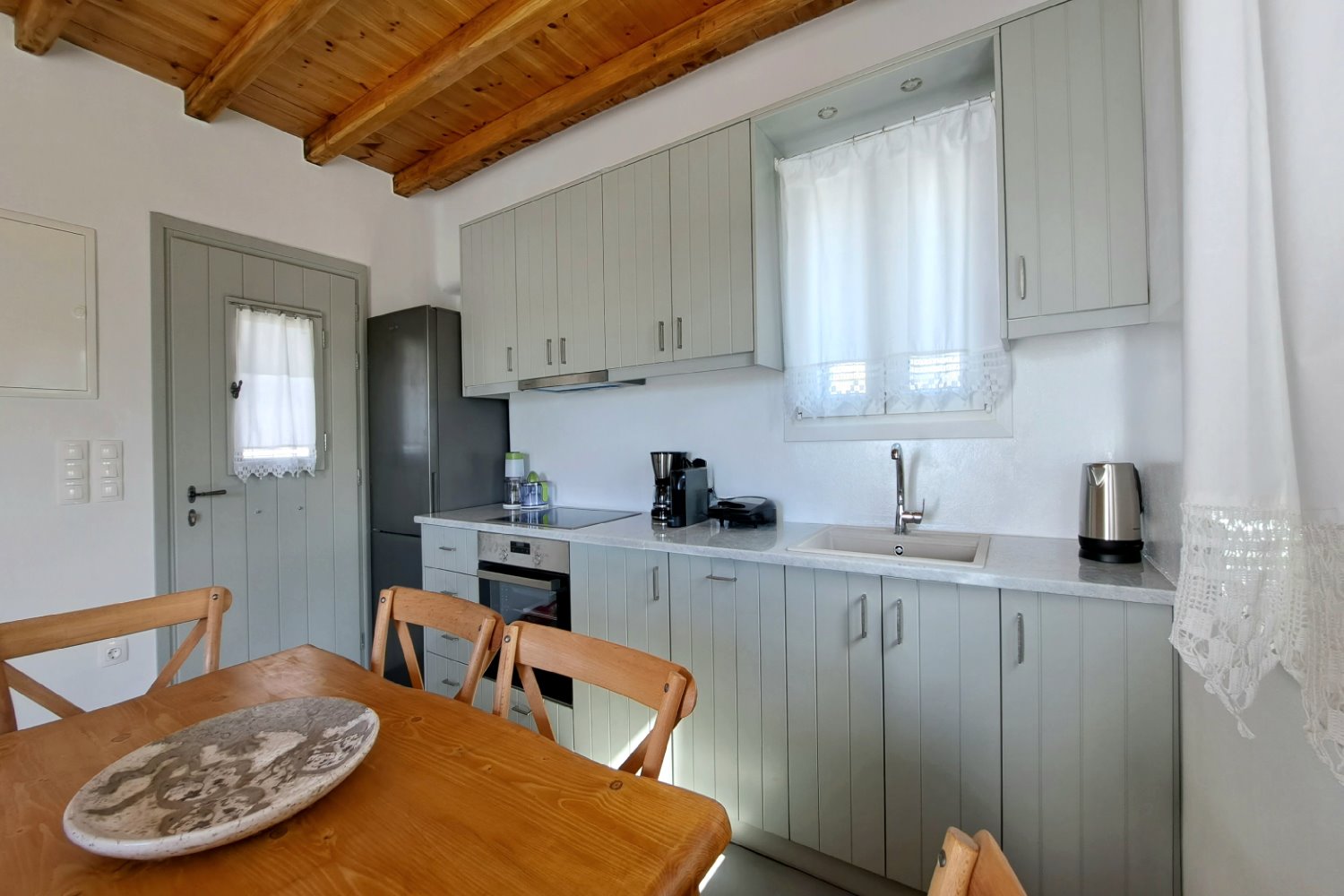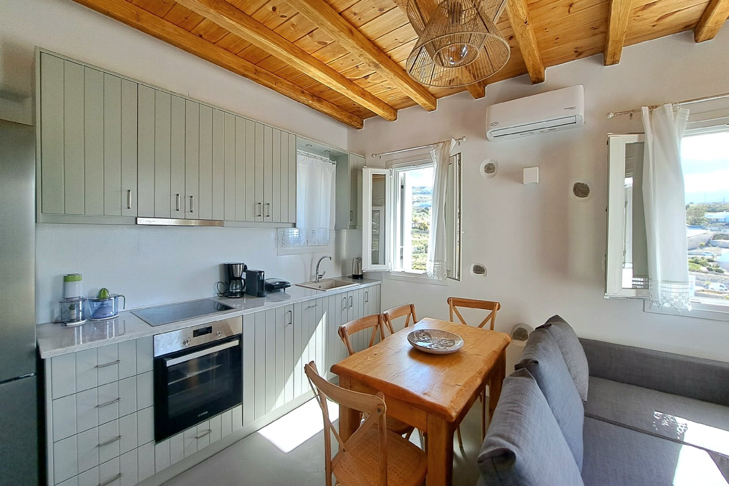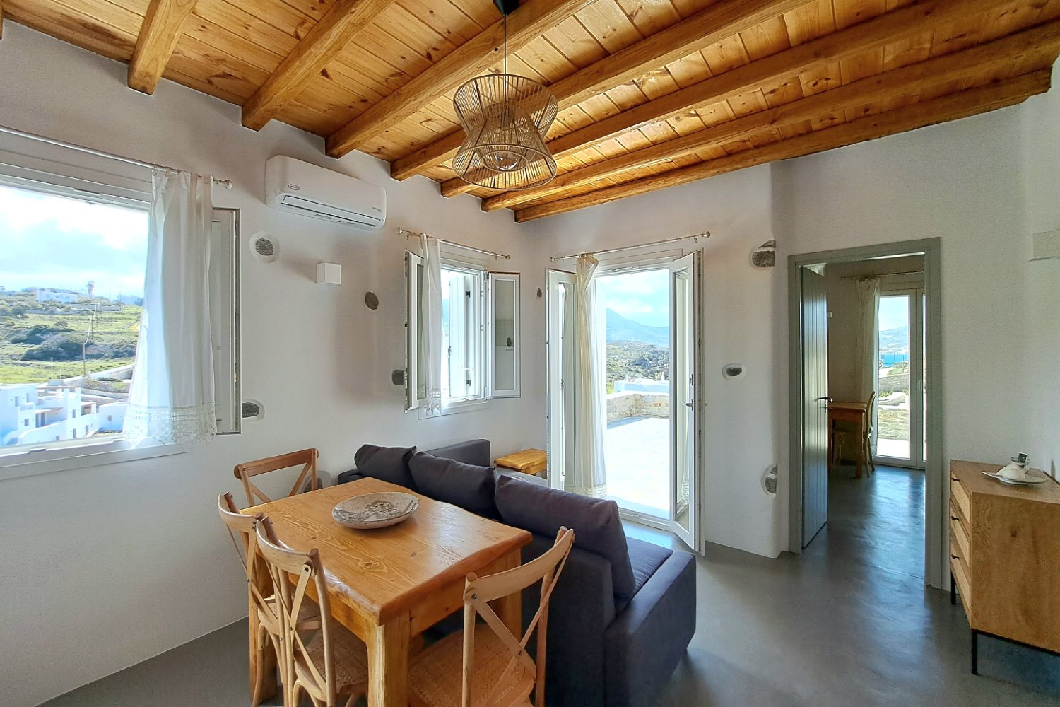 It is a 50m2 one-bedroom house, ideal for couples and families with 1-2 children. The bedroom faces southeast, has a double queen bed and direct access to the main terrace with sea views. A full bathroom can meet your personal needs. Living room, dining room and kitchen are concentrated in the central room. The corner sofa can easily be converted into a double bed and there is space for 4 people at the dining table. The kitchen is fully equipped and offers direct access to the barbecue in the backyard. On the front terrace you can enjoy your breakfast, lunch or dinner or relax on the sun loungers and enjoy the sea views.