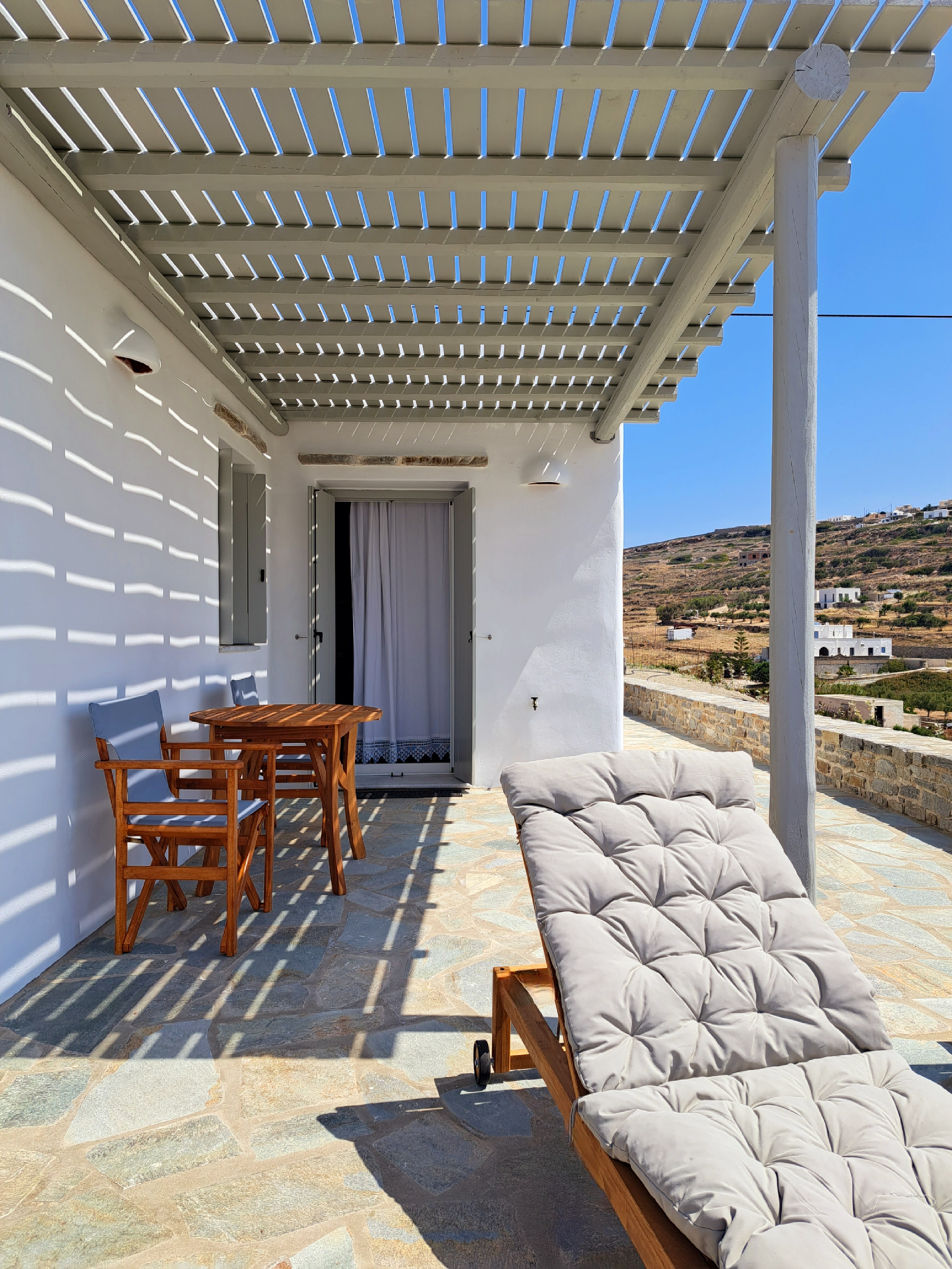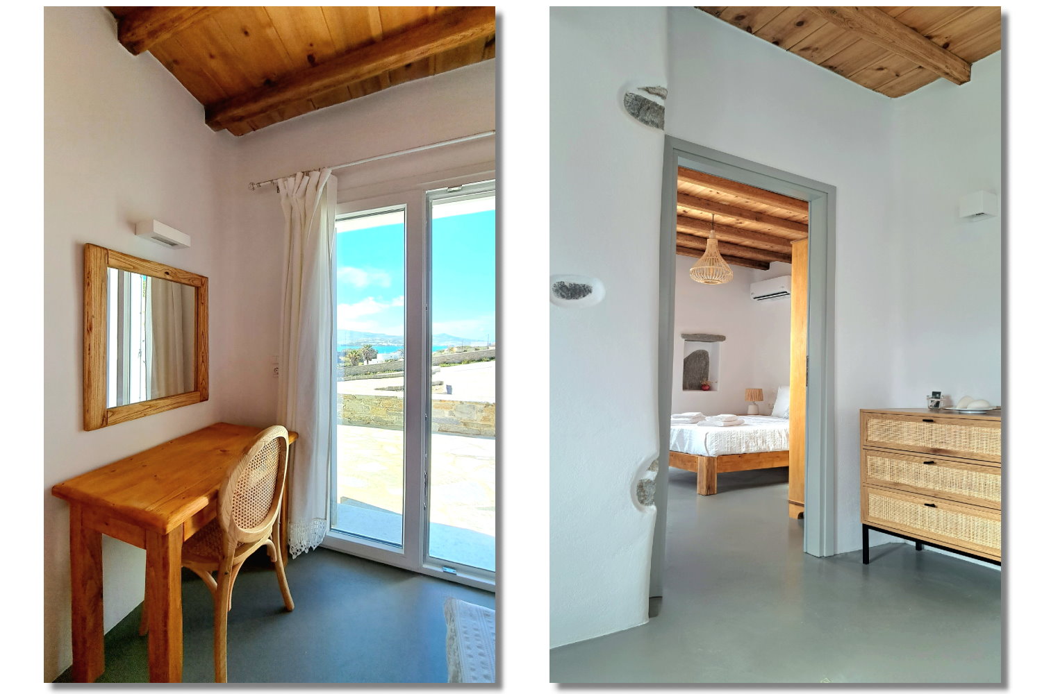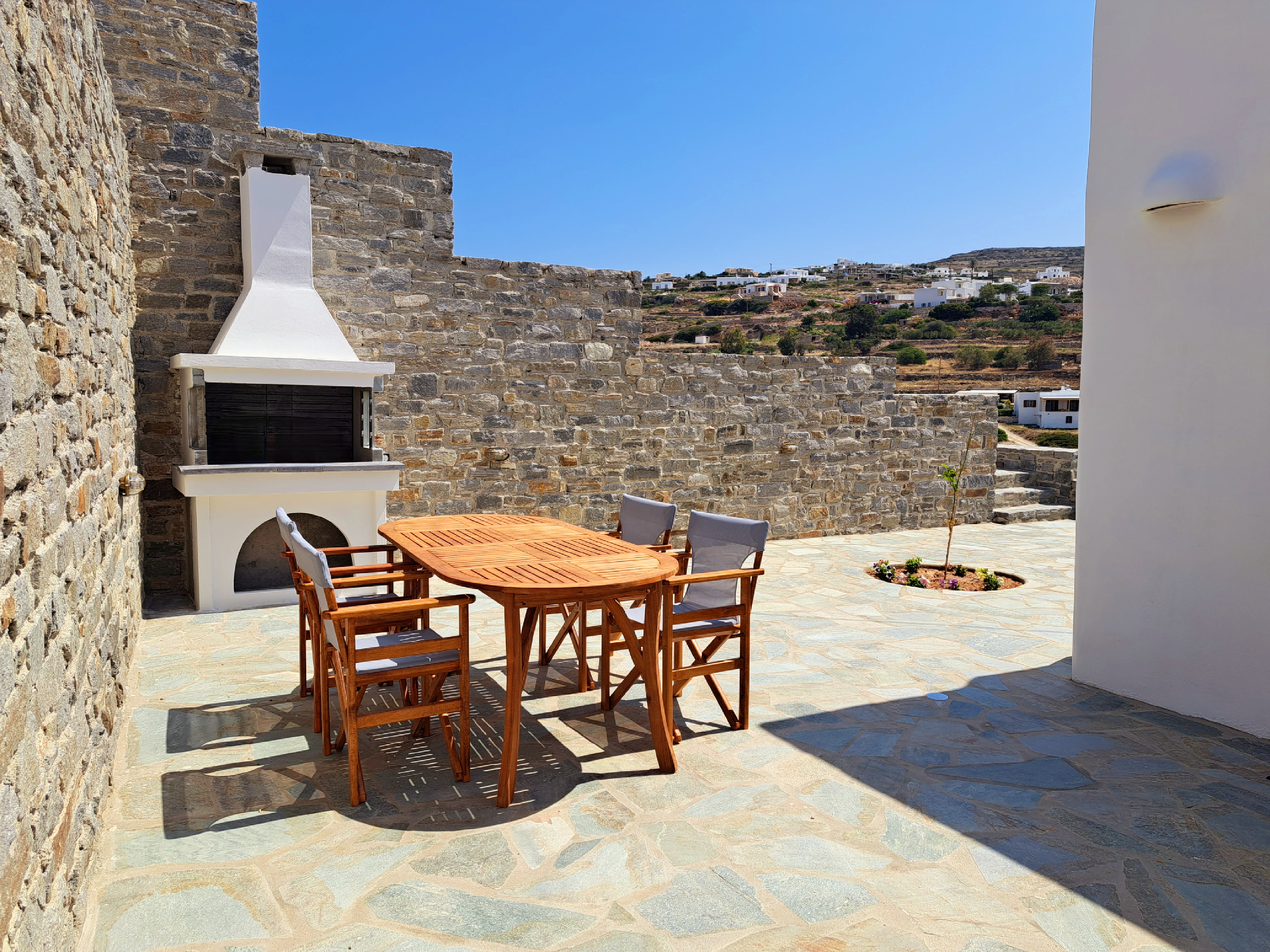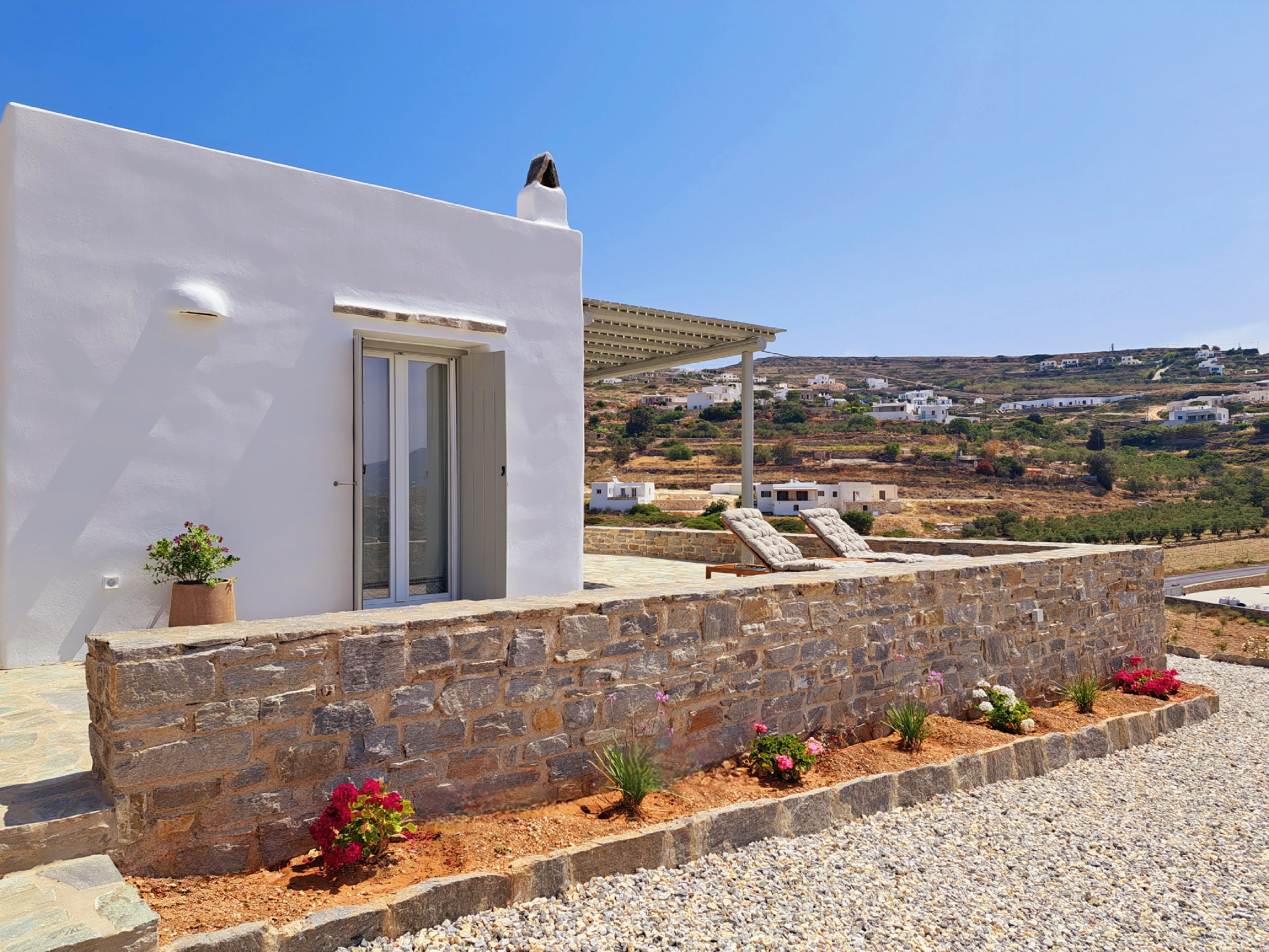 It is a 50m2 one-bedroom house, ideal for couples and families with 1-2 children. The bedroom faces southeast, has a double queen bed and direct access to the main terrace with sea views. A full bathroom can meet your personal needs. Living room, dining room and kitchen are concentrated in the central room. The corner sofa can easily be converted into a double bed and there is space for 4 people at the dining table. The kitchen is fully equipped and offers direct access to the barbecue in the backyard. On the front terrace you can enjoy your breakfast, lunch or dinner or relax on the sun loungers and enjoy the sea views.