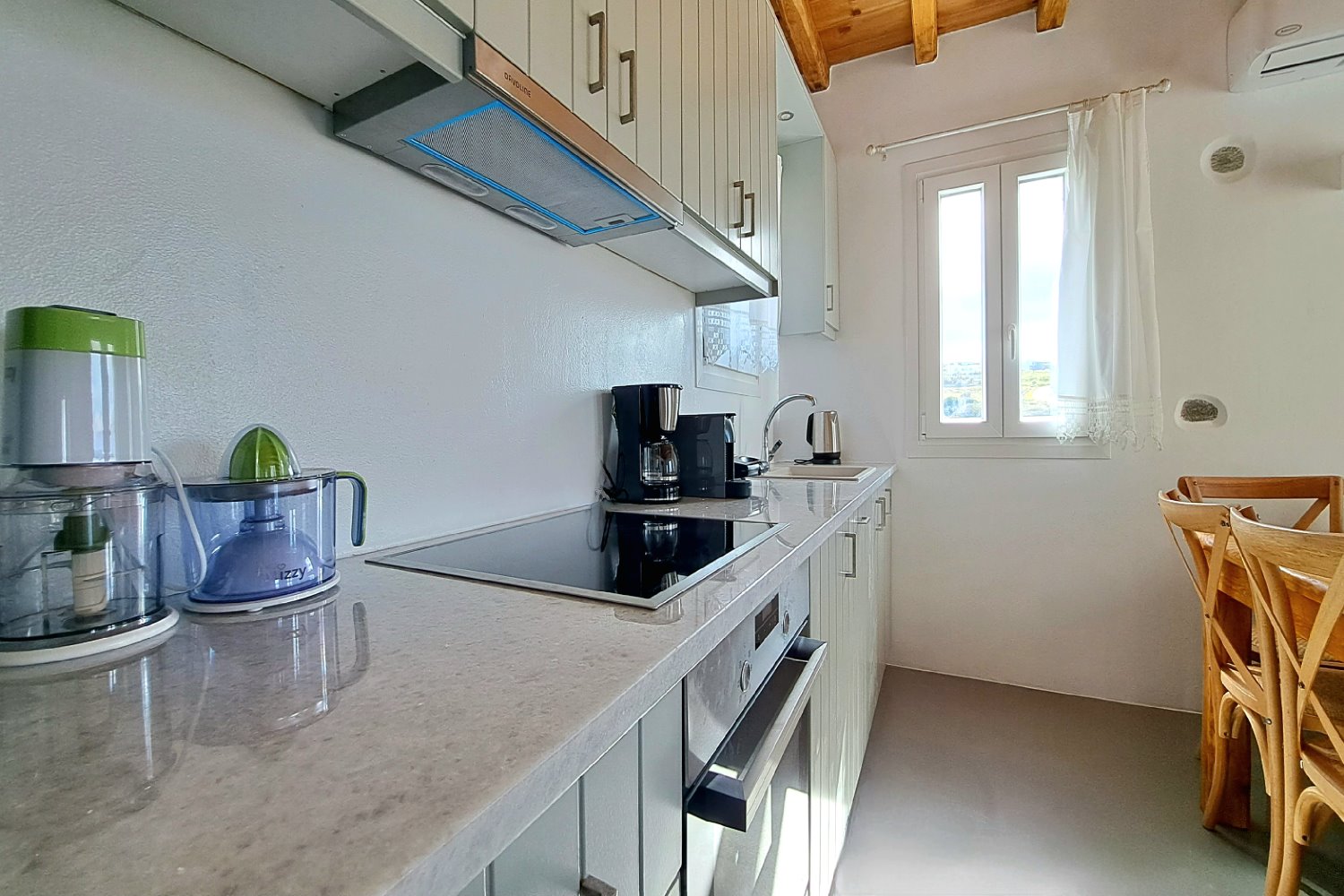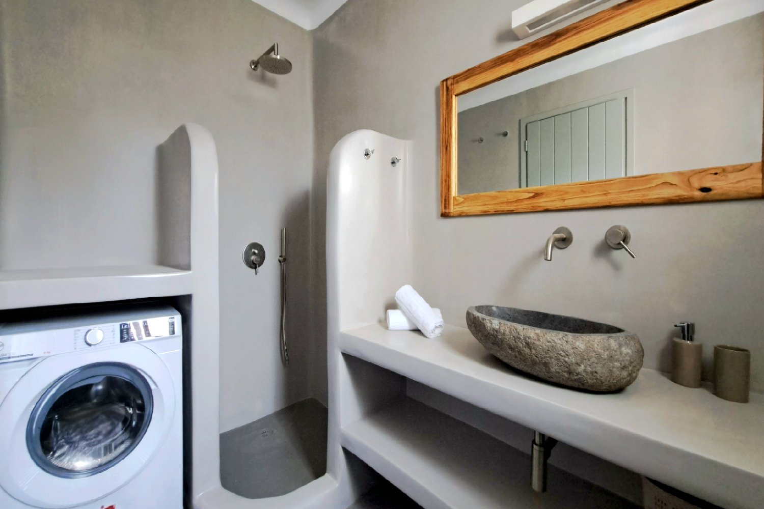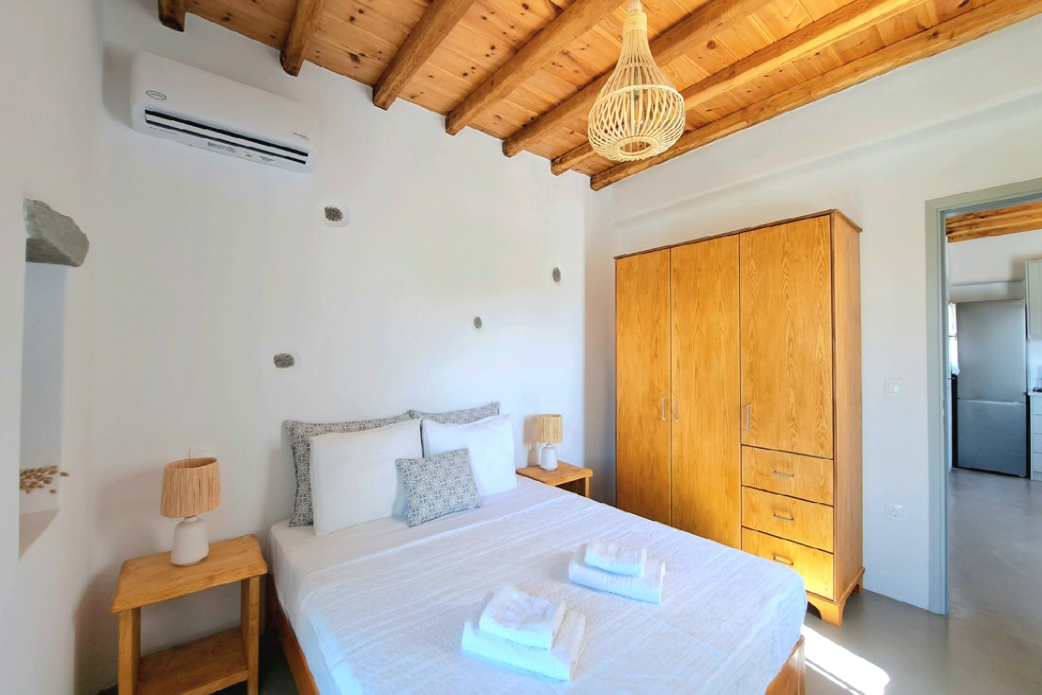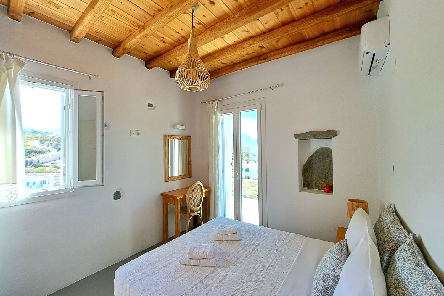 It is a 50m2 one-bedroom house, ideal for couples and families with 1-2 children. The bedroom faces southeast, has a double queen bed and direct access to the main terrace with sea views. A full bathroom can meet your personal needs. Living room, dining room and kitchen are concentrated in the central room. The corner sofa can easily be converted into a double bed and there is space for 4 people at the dining table. The kitchen is fully equipped and offers direct access to the barbecue in the backyard. On the front terrace you can enjoy your breakfast, lunch or dinner or relax on the sun loungers and enjoy the sea views.