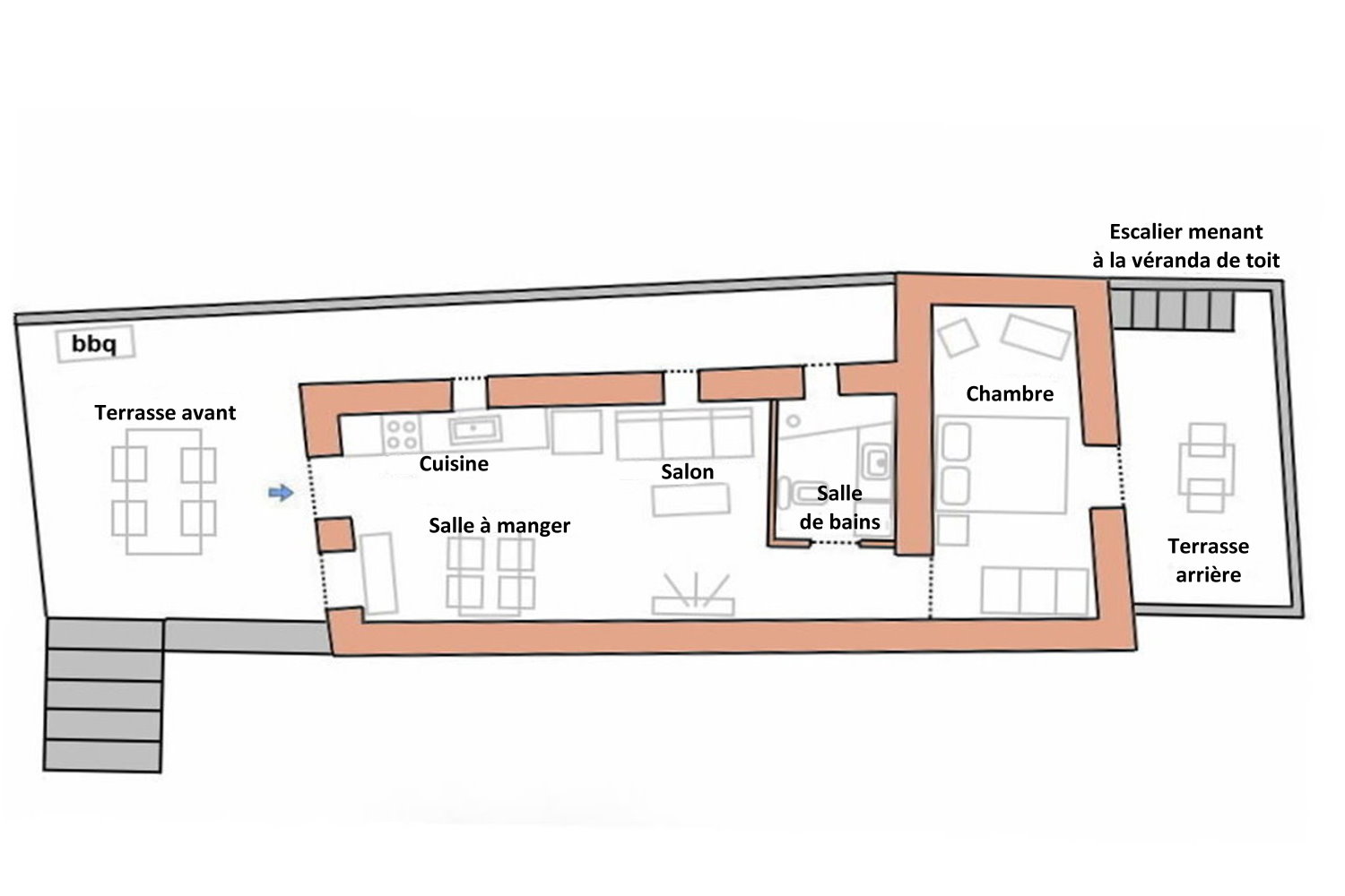 C'est une maison de 55m² d'une chambre, idéale pour les couples ou les familles avec 1-2 enfants. La chambre est orientée au nord et possède sa proper terrasse menant à la véranda sur le toit avec vue sur la mer. Une salle de bain complète peut répondre à vos besoins personnels. La pièce centrale comprend un salon, une salle à manger et une cuisine. Le salon dispose d’un canapé lit gigogne convertible en lit double ou en deux lits simples, et la salle à manger peut accueillir 4 personnes. La cuisine entièrement équipée mène directement à la terrasse avant, où vous pourrez griller et déguster des repas avec vue sur la colline opposée.